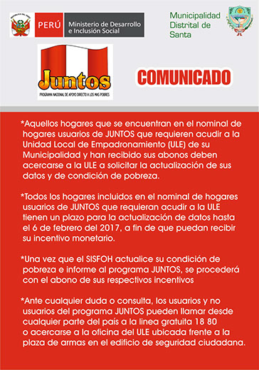 Señor Germán Rojas Soto, alcalde de Santa estubo en el C.P. San Luis para constatar los avances de la obra de agua y desagüe y además visitó el terreno donde se construirán las pozas de las lagunas de oxidación, se vienen realizando ya, las conexiones domiciliarias. En el C.P. Santa Rosa se viene culminando la obra de pista y veredas ademas de un parquesito, el dia de mañana se estará colocando la capa final de asfalto, con lo cuál se estará terminando y en los próximos dias se hara entrega de esta importante obra.