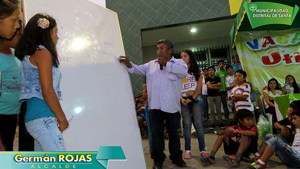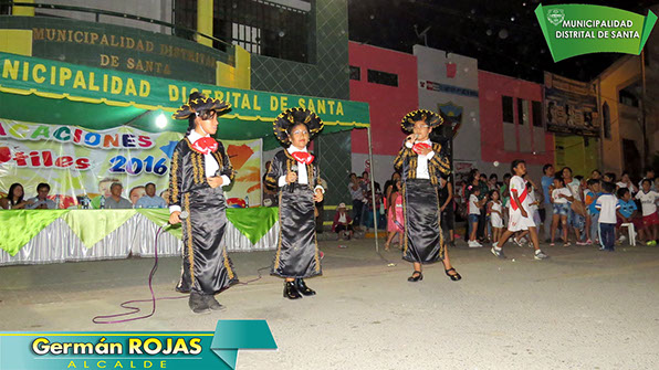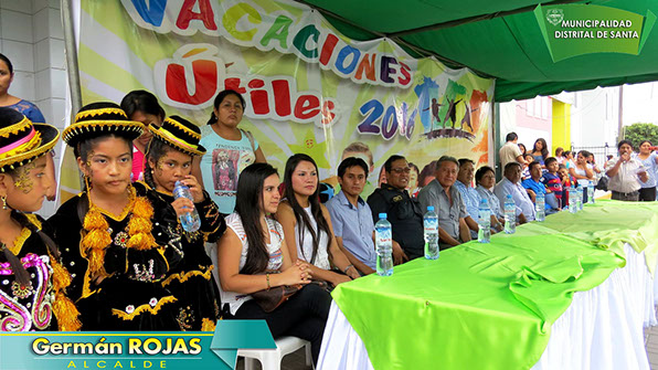 La Municipalidad Distrital de Santa, realizó la clausura del programa de vacaciones útiles 2016, contando con la masiva participación de madres de familia, niños y jóvenes; quienes pusieron de manifiesto lo aprendido durante los talleres de manualidades, canto, baile moderno, marinera, computación kid's, computación básica, diseño gráfico, reforzamiento educativo en el nivel primaria - secundaria, futbol y voley.