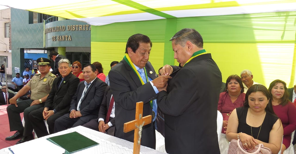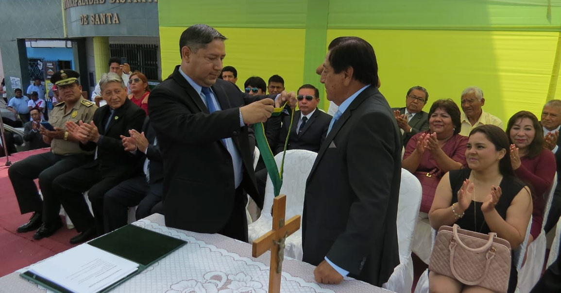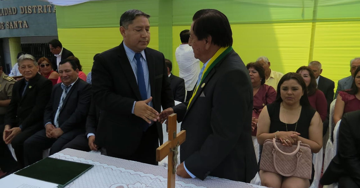 #Hoy En una emotiva ceremonia se llevó a cabo la Juramentación de las nuevas autoridades ediles de nuestro Distrito de Santa. El señor Eugenio Jara Acosta junto a sus regidores: Jorge Luis Espejo Llacas, Jesús Moreno Enríquez, Óscar Gonzales Risco, Yumixsa Livved Ramos Cornejo y Eligio Obeso Ibáñez; hicieron su juramento ante los asistentes, quienes coincidieron en trabajar incansablemente en favor de la población.