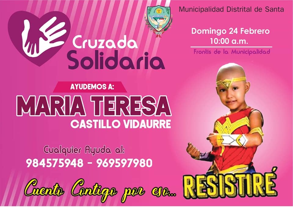 La Municipalidad Distrital de Santa encabezado por el Alcalde Eugenio Jara y un grupo de jóvenes Santeños liderado por la Srta. Zaida Paredes Vera, realizarán una cruzada solidaria en favor de la niña Maria Teresa Castillo Vidaurre.