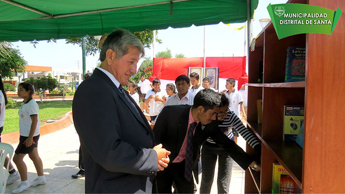 La Señora Fabiola Balarezo, encargada de la Biblioteca Municipal, invitó a la población a visitar sus instalaciones, que cuenta de una biblioteca virtual, asi mismo de mas 1700 libros de todas las materias y un amplio catálogo bibliográfico. Esta importante exposición contó tambien con la presencia del señor regidor Ivan Arismendiz de la Cruz, y del Gerente Municipal Lic. Omar Tamayo Quiliche, quienes concidieron en la importancia de seguir realizando este tipo de eventos en favor de nuestra niñez y juventud santeña.